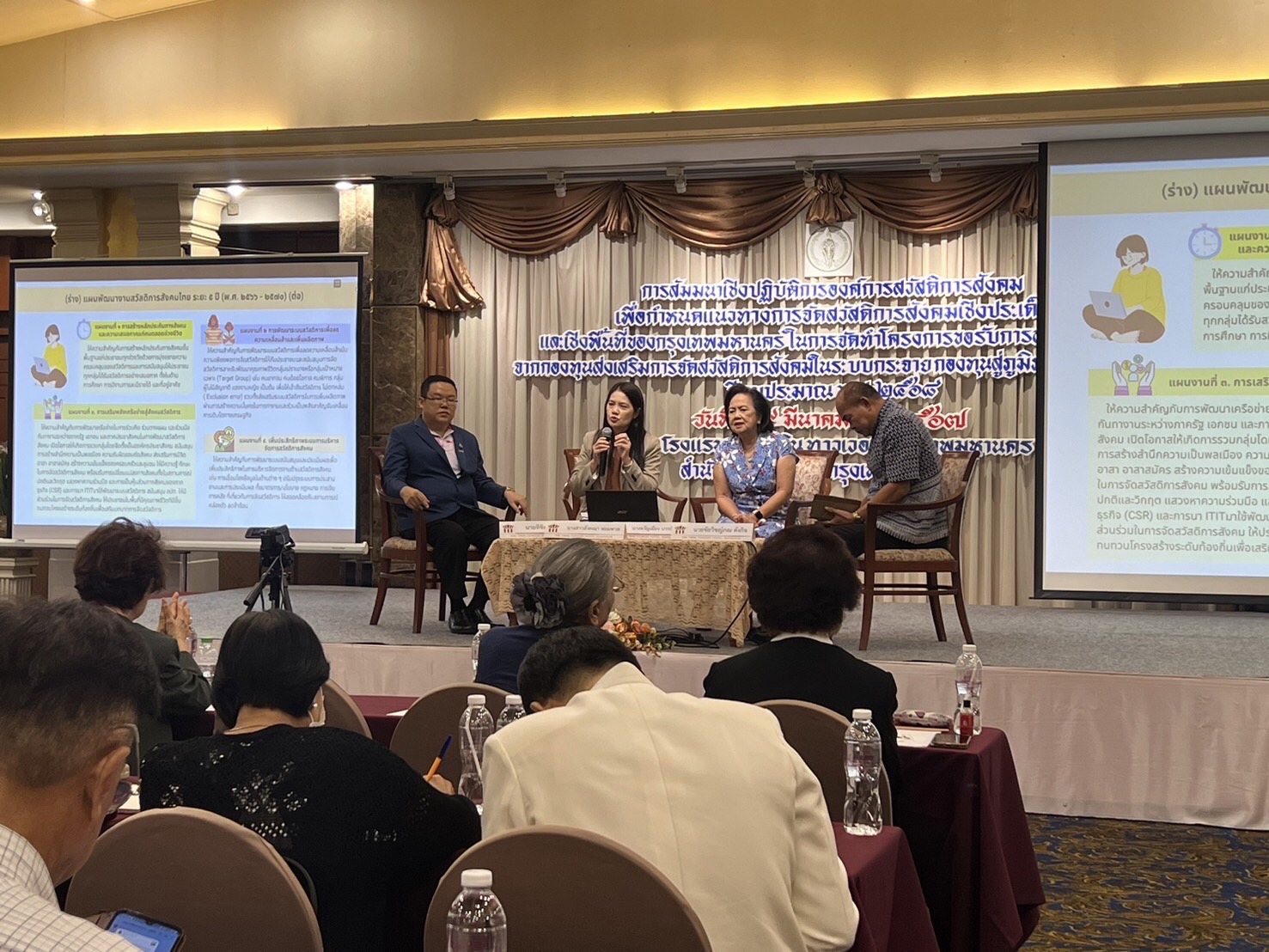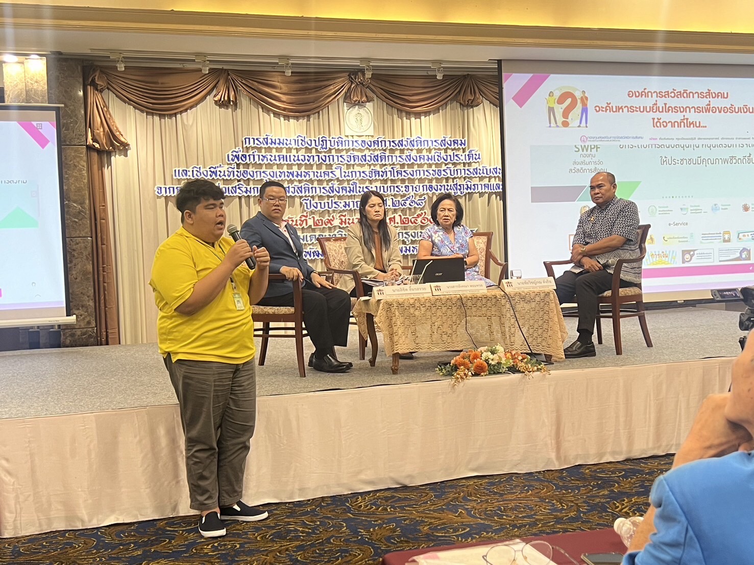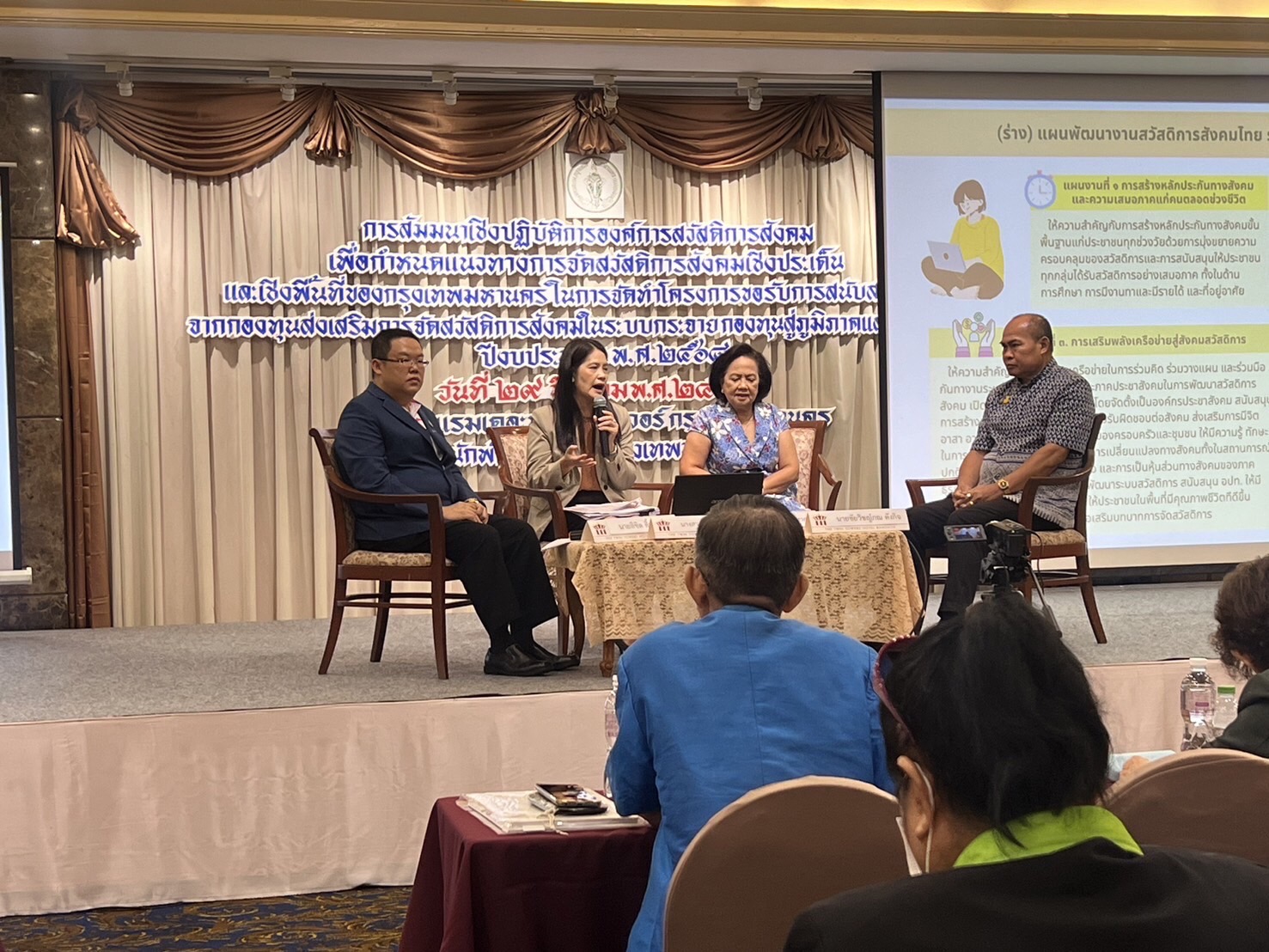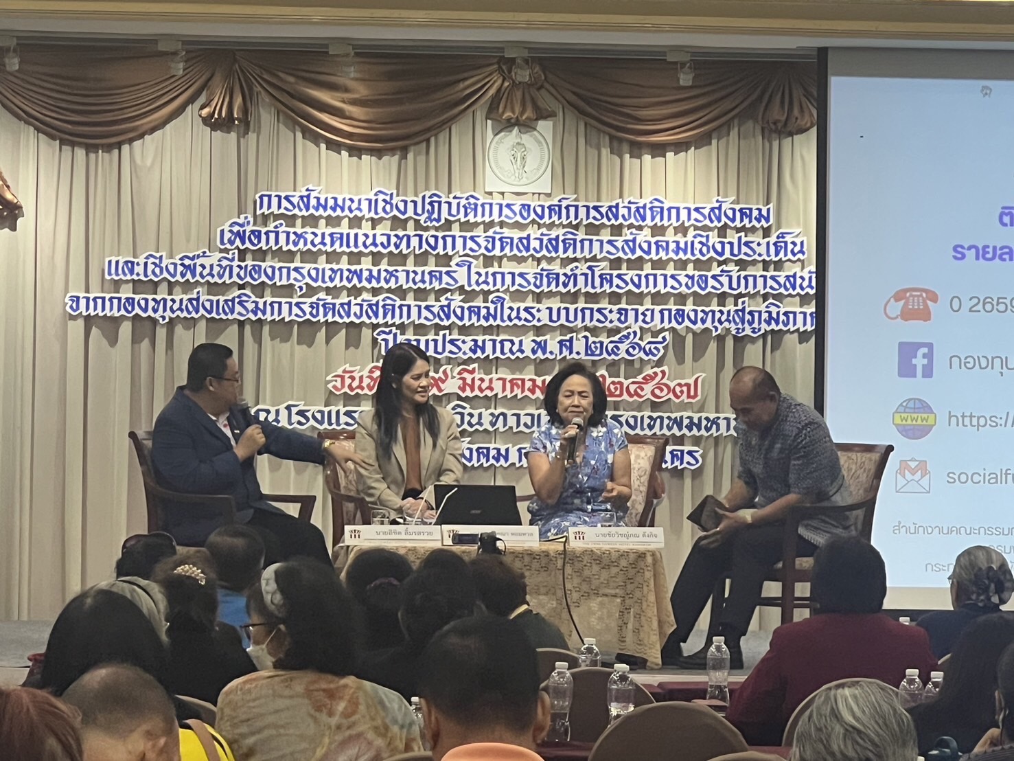 วันศุกร์ที่ 29 มีนาคม 2567 เวลา 09.00 น. ณ ห้องประชุมกษัตริย์ศึก 2 โรงแรมเดอะทวิน ทาวเวอร์ กรุงเทพมหานคร สำนักพัฒนาสังคม กรุงเทพมหานคร จัดสัมมนาเชิงปฏิบัติการองค์การสวัสดิการสังคมเพื่อกำหนดแนวทางการจัดสวัสดิการสังคมเชิงประเด็นและเชิงพื้นที่ของกรุงเทพมหานคร ในการจัดทำโครงการขอรับการสนับสนุนจากกองทุนส่งเสริมการจัดสวัสดิการสังคมในระบบกระจายกองทุนสู่ภูมิภาคและท้องถิ่น ประจำปี 2568 โดยผู้อำนวยการสำนักงานคณะกรรมการส่งเสริมการจัดสวัสดิการสังคมแห่งชาติ มอบหมายให้ นางอังคณา หอมหวน หัวหน้ากลุ่มส่งเสริมองค์การสวัสดิการสังคมและความรับผิดชอบต่อสังคม และเจ้าหน้าที่กองทุนฯ เป็นวิทยากรอภิปรายเรื่อง ?การพัฒนาศักยภาพองค์การสวัสดิการสังคม เพื่อส่งเสริมการจัดสวัสดิการสังคมและขับเคลื่อนงานสวัสดิการสังคมในพื้นที่กรุงเทพมหานคร? รวมถึงให้ความรู้เกี่ยวกับการใช้งานระบบยื่นโครงการเพื่อขอรับเงินกองทุนส่งเสริมการจัดสวัสดิการสังคม เพื่อให้องค์การสวัสดิการสังคมในพื้นที่กรุงงเทพมหานคร ได้ทราบและสามารถใช้งานระบบฯ ดังกล่าวได้จริง โดยในการสัมมนาฯ มีผู้เข้าร่วม ประกอบด้วย องค์การสวัสดิการสังคม มูลนิธิ สมาคม และเจ้าหน้าที่สำนักงานเขต ในกรุงเทพมหานคร รวมทั้งสิ้น 450 คน