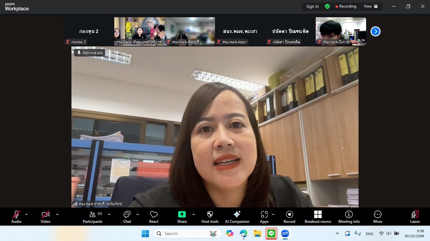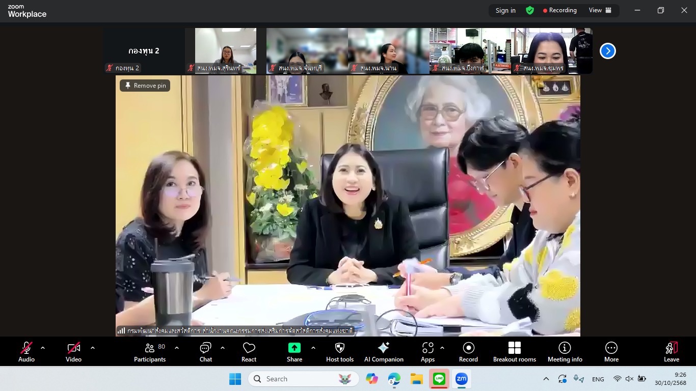 วันพฤหัสบดีที่ ๓๐ ตุลาคม ๒๕๖๘ เวลา ๐๙.๓๐ น. ณ ห้องประชุม ๒ สำนักงานคณะกรรมการส่งเสริมการจัดสวัสดิการสังคมแห่งชาติ กรมพัฒนาสังคมและสวัสดิการ โดยมีนางสาวสิชากาณจ์ ศิไพบุณณากาณจ์ ผู้อำนวยการสำนักงาน ก.ส.ค. เป็นประธานการประชุม โดยมีผู้ปฏิบัติงานกองทุนฯ เข้าร่วมประชุม จำนวน ๗๖ จังหวัด เพื่อติดตามการดำเนินงานและแลกเปลี่ยนเรียนรู้การทำงานร่วมกัน และเรื่องอื่น ๆ ที่เกี่ยวข้อง ดังนี้