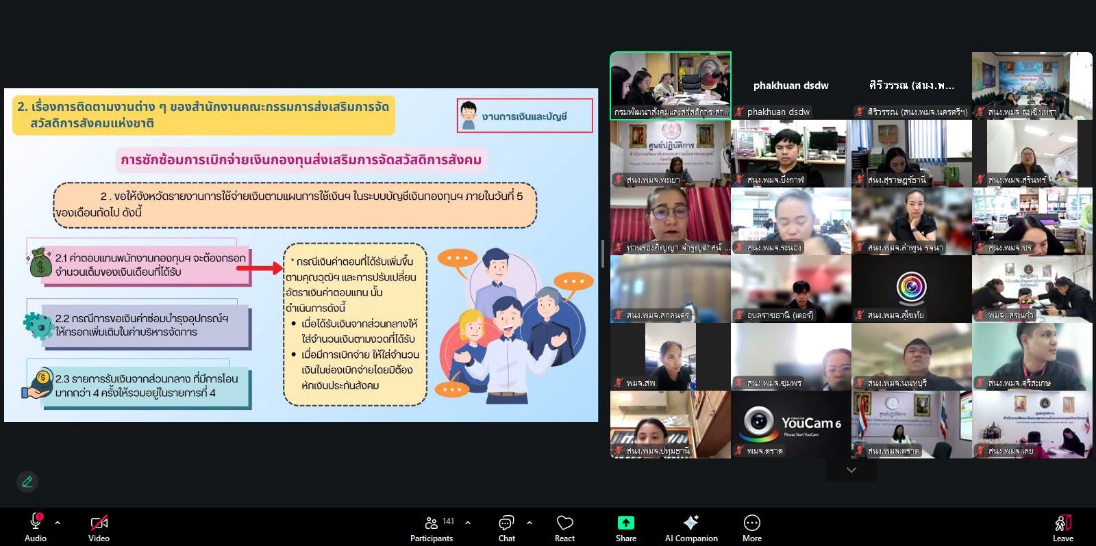 วันพฤหัสบดีที่ ๒๗ พฤศจิกายน ๒๕๖๘ เวลา ๑๓.๓๐ น. ณ ห้องประชุม ๒ สำนักงานคณะกรรมการส่งเสริมการจัดสวัสดิการสังคมแห่งชาติ กรมพัฒนาสังคมและสวัสดิการ โดยมีนางภิญญา จำรูญศาสน์ รองอธิบดีกรมพัฒนาสังคมและสวัสดิการ เป็นประธานการประชุม โดยมีผู้ปฏิบัติงานกองทุนฯ เข้าร่วมประชุม จำนวน ๗๔ จังหวัด เพื่อติดตามการดำเนินงานและแลกเปลี่ยนเรียนรู้การทำงานร่วมกัน และเรื่องอื่น ๆ ที่เกี่ยวข้อง ดังนี้