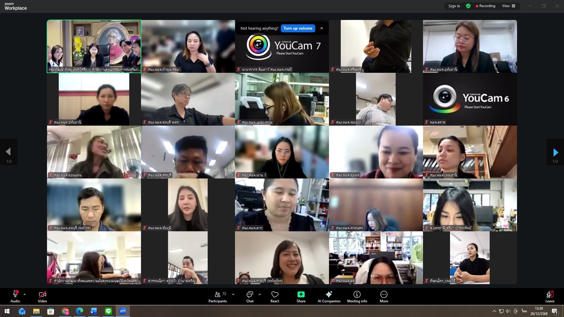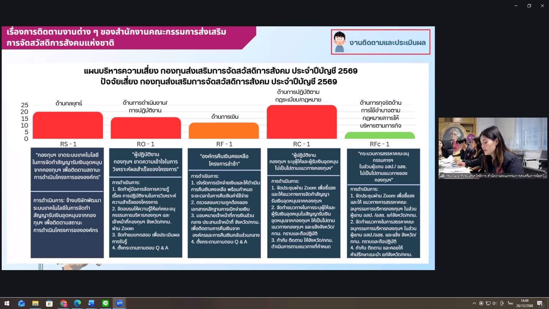 วันศุกร์ที่ ๒๖ ธันวาคม ๒๕๖๘ เวลา ๑๓.๓๐ น. ณ ห้องประชุม ๒ สำนักงานคณะกรรมการส่งเสริมการจัดสวัสดิการสังคมแห่งชาติ กรมพัฒนาสังคมและสวัสดิการ โดยมีนางสาวสิชากาณจ์ ศิไพบุณณากาณจ์ ผู้อำนวยการสำนักงาน ก.ส.ค. เป็นประธานการประชุม และมีผู้ปฏิบัติงานกองทุนฯ เข้าร่วมประชุม จำนวน ๗๒ จังหวัด เพื่อติดตามการดำเนินงานและแลกเปลี่ยนเรียนรู้การทำงานร่วมกัน และเรื่องอื่น ๆ ที่เกี่ยวข้อง ดังนี้