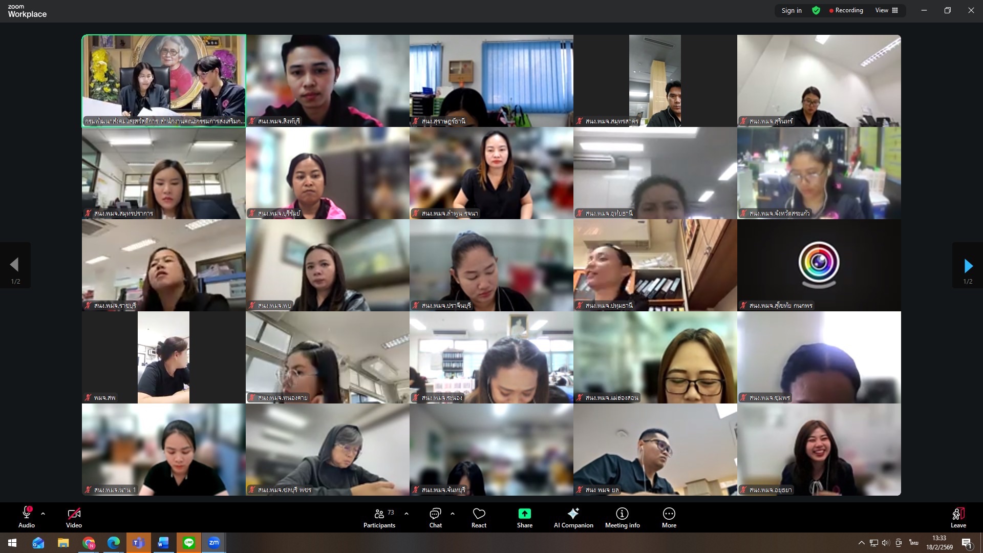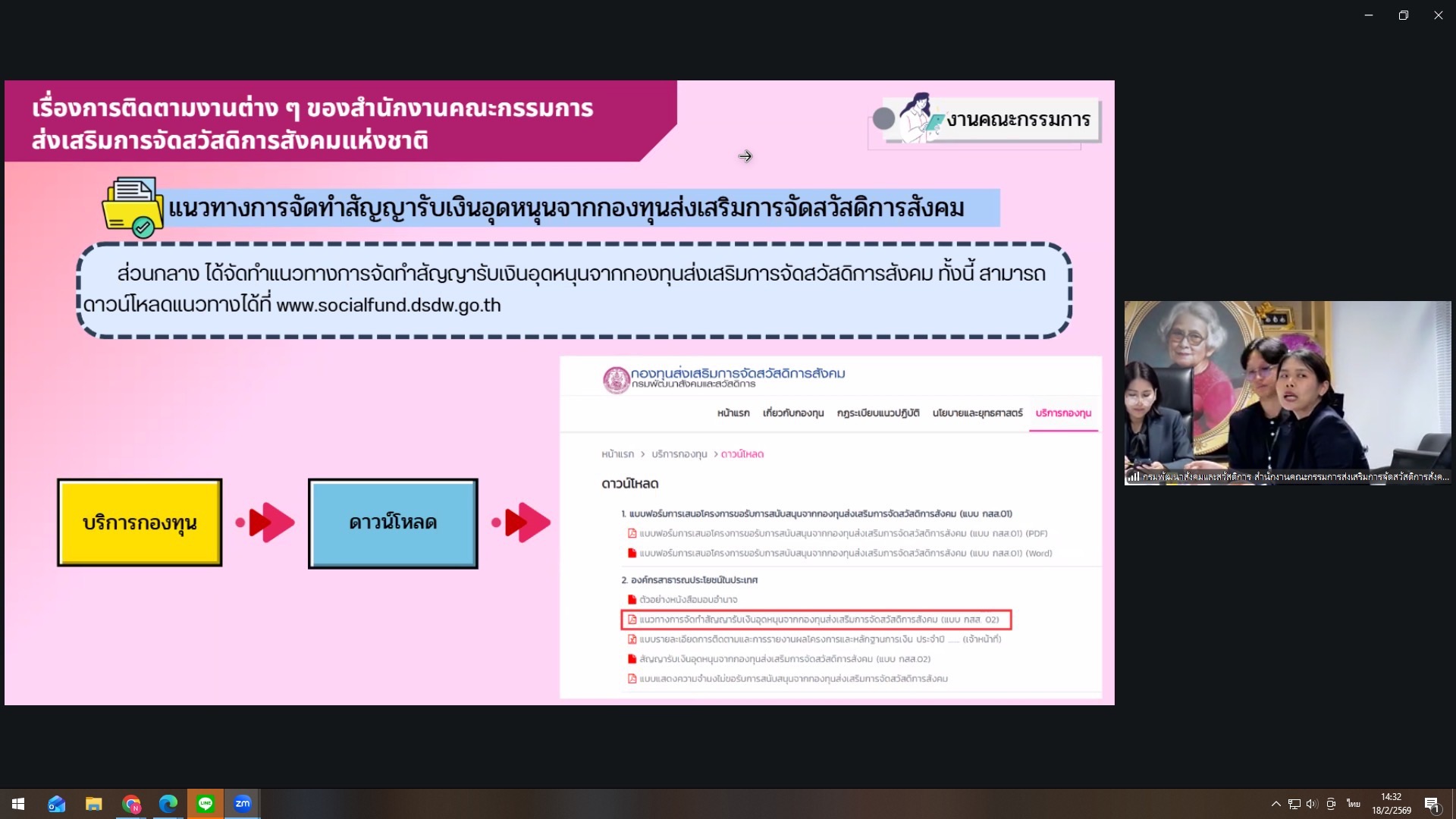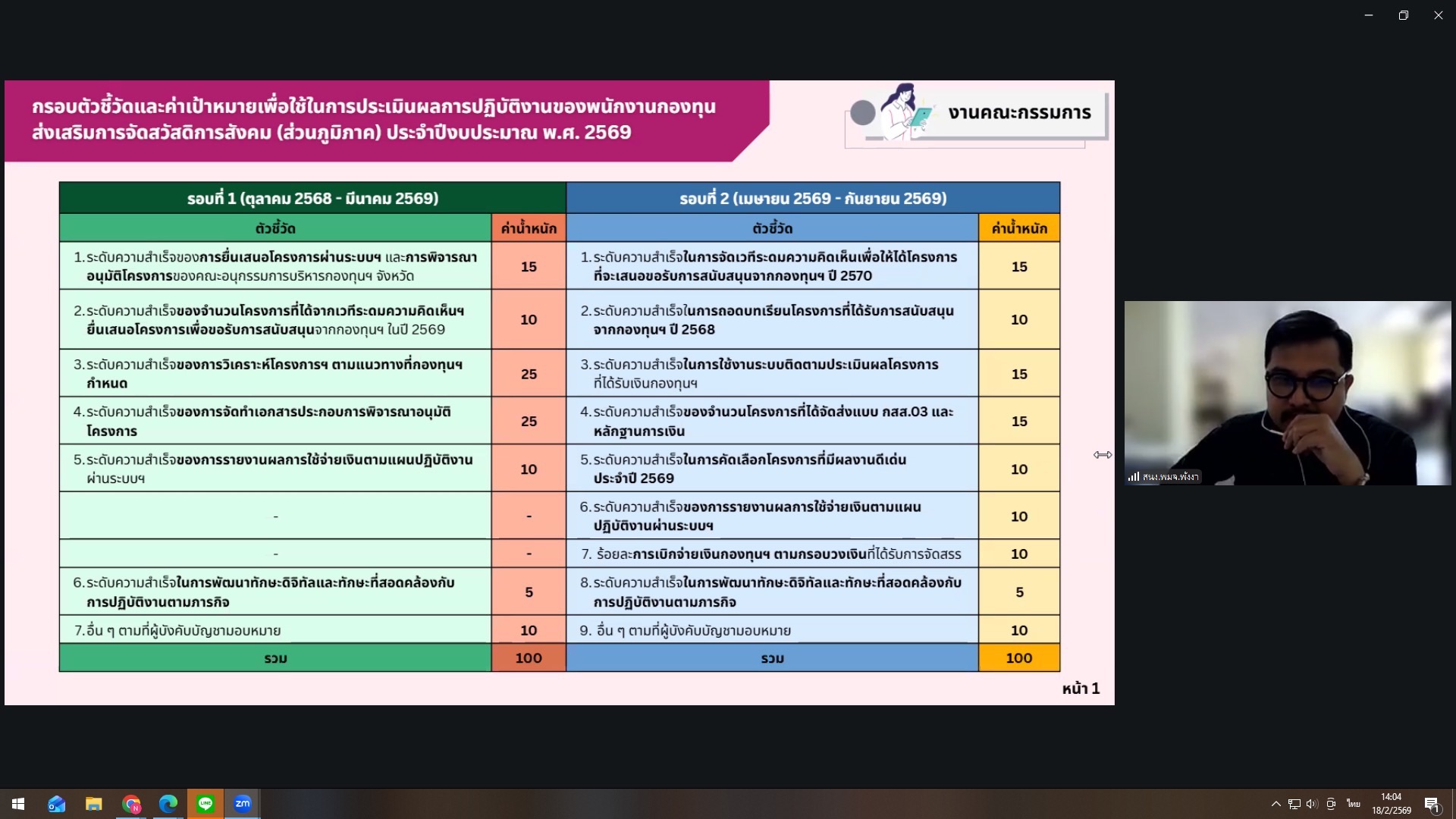 วันพุธที่ ๑๘ กุมภาพันธ์ ๒๕๖๙ เวลา ๑๓.๓๐ น. ณ ห้องประชุม ๒ สำนักงานคณะกรรมการส่งเสริมการจัดสวัสดิการสังคมแห่งชาติ กรมพัฒนาสังคมและสวัสดิการ โดยมีนางสาวสิชากาณจ์ ศิไพบุณณากาณจ์ ผู้อำนวยการสำนักงาน ก.ส.ค. เป็นประธานการประชุม และมีผู้ปฏิบัติงานกองทุนฯ เข้าร่วมประชุม จำนวน ๗๔ จังหวัด เพื่อติดตามการดำเนินงานและแลกเปลี่ยนเรียนรู้การทำงานร่วมกัน และเรื่องอื่น ๆ ที่เกี่ยวข้อง ดังนี้