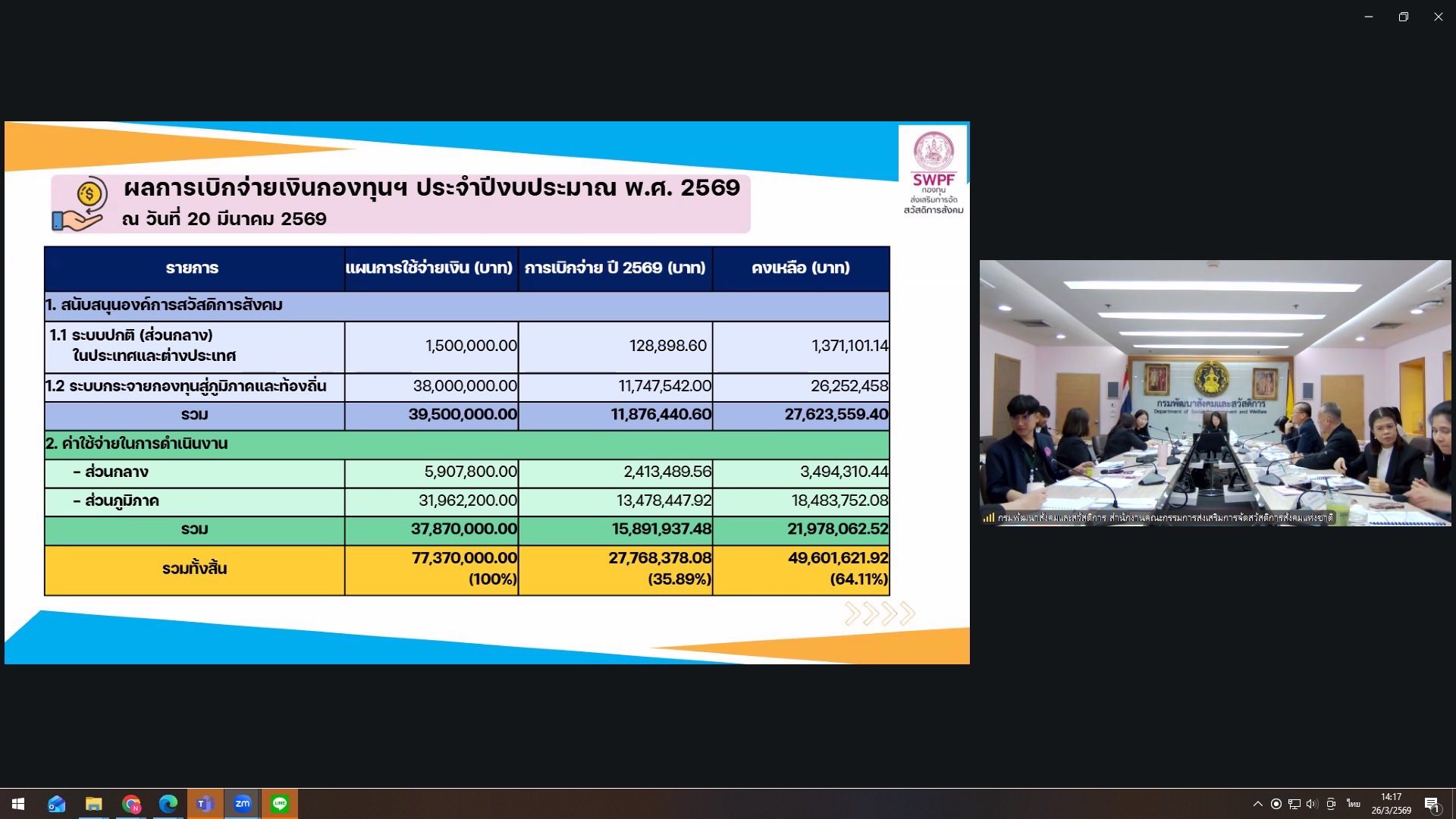 - ผลการเบิกจ่ายเงินกองทุนส่งเสริมการจัดสวัสดิการสังคม ประจำปีงบประมาณ พ.ศ. 2569 ณ วันที่ 20 มีนาคม 2569