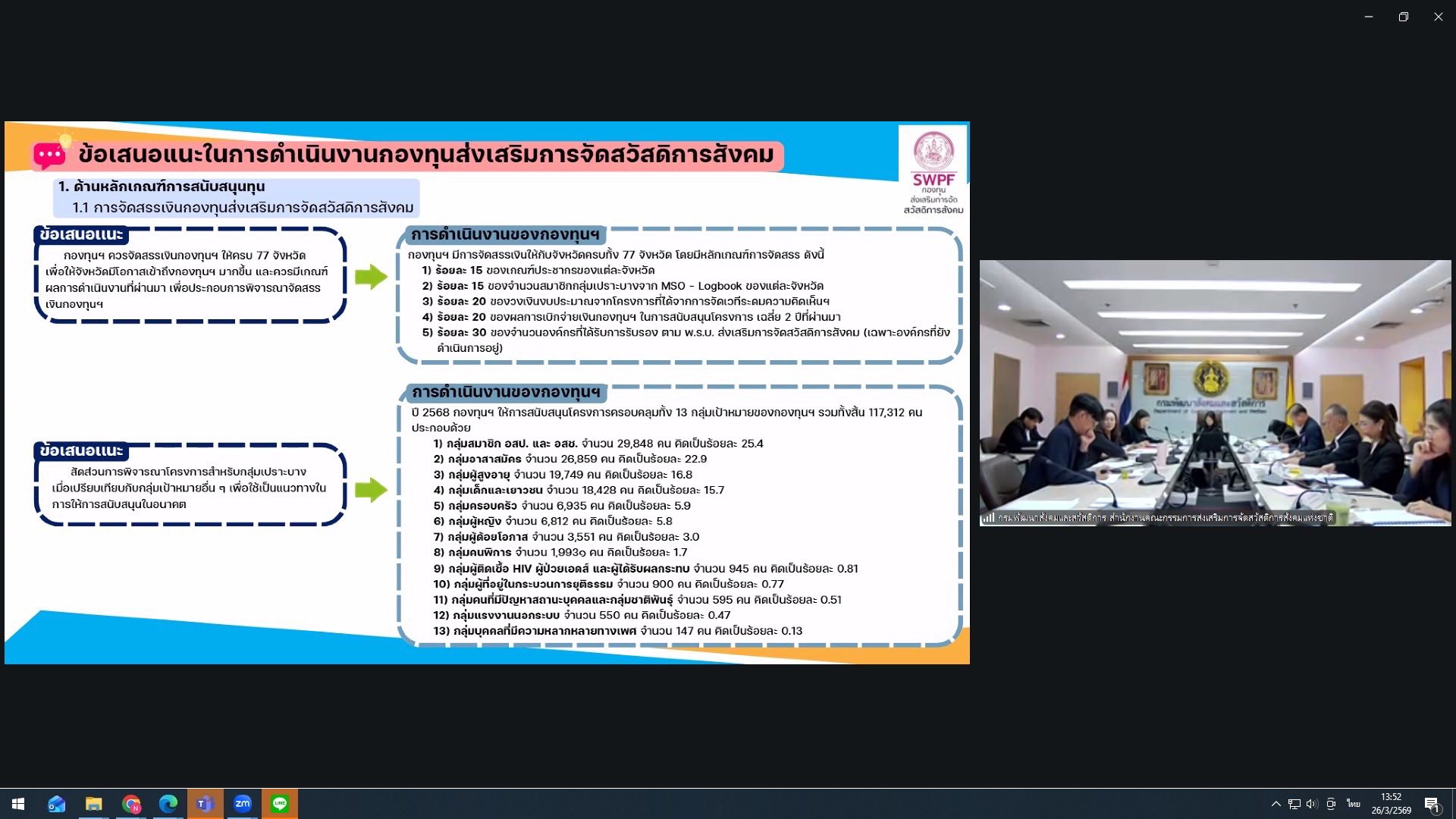 วันพฤหัสบดีที่ 26 มีนาคม 2569 เวลา 13.30 น. ณ ห้องประชุมกรมพัฒนาสังคมและสวัสดิการ ชั้น 6 อาคารกรมพัฒนาสังคมและสวัสดิการ ดร.วิจิตา รชตะนันทิกุล เป็นประธานการประชุมคณะกรรมการติดตามและประเมินผลการดำเนินงานของกองทุนส่งเสริมการจัดสวัสดิการสังคม ครั้งที่ 1/2569 พร้อมด้วยข้าราชการ และเจ้าหน้าที่ เข้าร่วมประชุมฯ ซึ่งที่ประชุมได้ร่วมกันพิจารณาและรับทราบในเรื่องดังต่อไปนี้