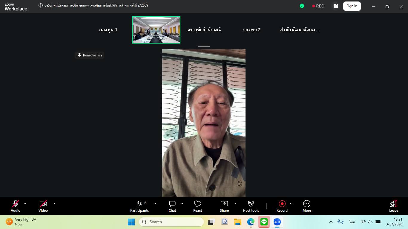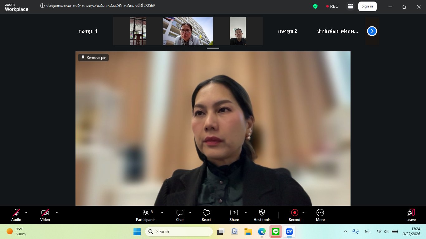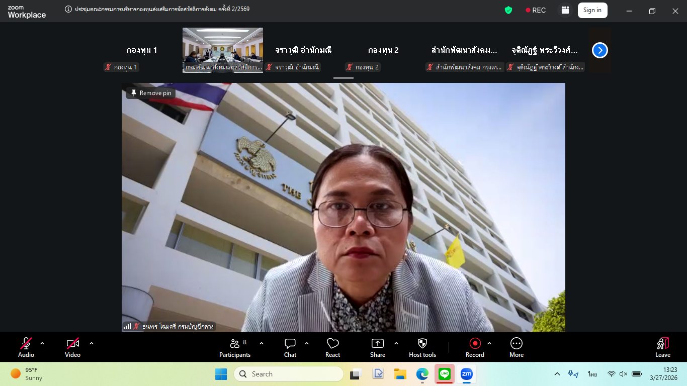 วันศุกร์ที่ 27 มีนาคม พ.ศ. 2569 เวลา 13.30 น. ณ ห้องประชุมชั้น 6 กรมพัฒนาสังคมและสวัสดิการ นางสาวสุนีย์ ศรีสง่าตระกูลเลิศ รองปลัดกระทรวงการพัฒนาสังคมและความมั่นคงของมนุษย์ เป็นประธานการประชุมคณะกรรมการบริหารกองทุนส่งเสริมการจัดสวัสดิการสังคม ครั้งที่ 2/2569 ในรูปแบบผสมผสาน (Hybrid Meeting) โดยนางสาวแรมรุ้ง วรวัธ อธิบดีกรมพัฒนาสังคมและสวัสดิการ มอบหมายให้ นายสุวิชชา วงศ์ไสลย์ ผู้เชี่ยวชาญเฉพาะด้านพัฒนาสังคม ทำหน้าที่รองประธาน ซึ่งมีข้าราชการและเจ้าหน้าที่เข้าร่วมประชุม โดยที่ประชุมร่วมกันพิจารณา ดังนี้